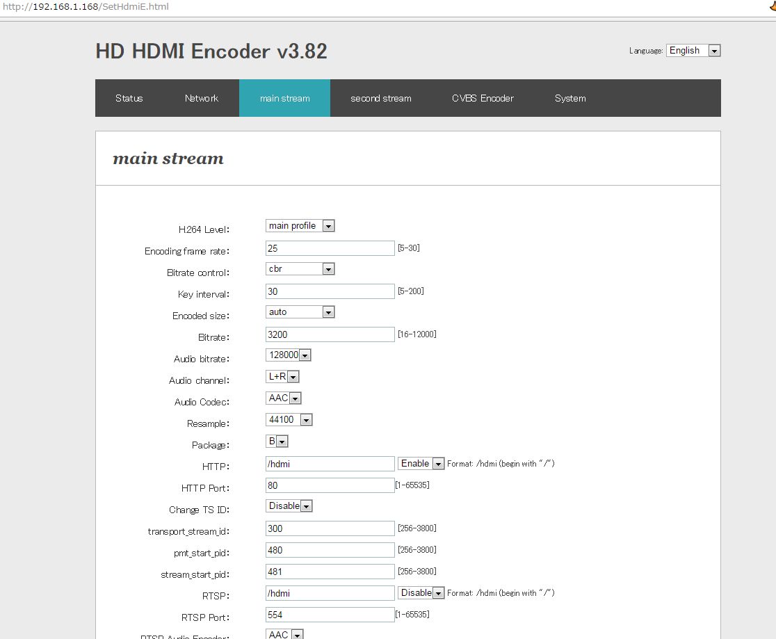 Web設定ページに入るには192.168.1.168がデフォルトのアドレスで、ID: admin / PW:adminとなる。