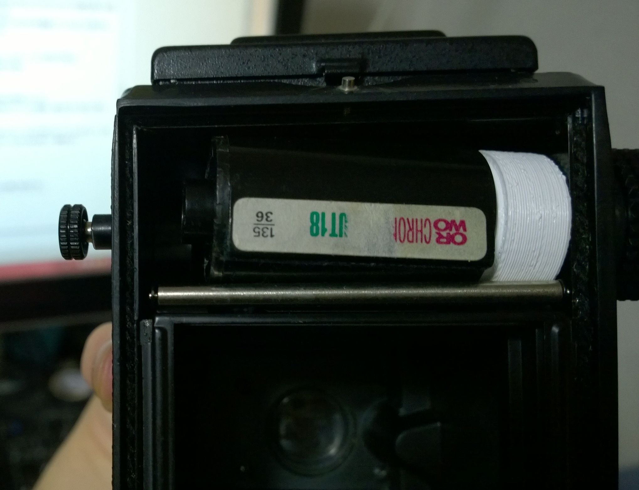 過去の記事を参考にすると分かるが、フィルムをセットする時に35mmフィルム用の120変換アダプターを使って装填する。