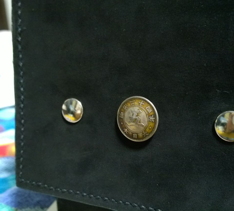 ボタンは旧の一円黄銅貨で作ったもの。